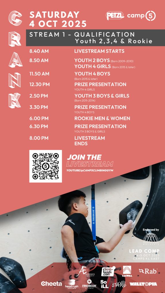 Age Categories follow the IFSC format – Competitors will compete in the age group based on the age they reached this year (2025). For example, if a competitor is 10 years old in May, but turns 11 anytime between May and 31st December 2025, they will participate in Y3 (U15).