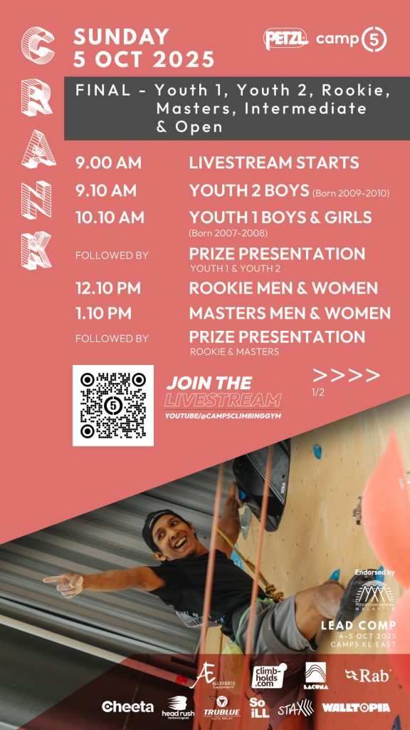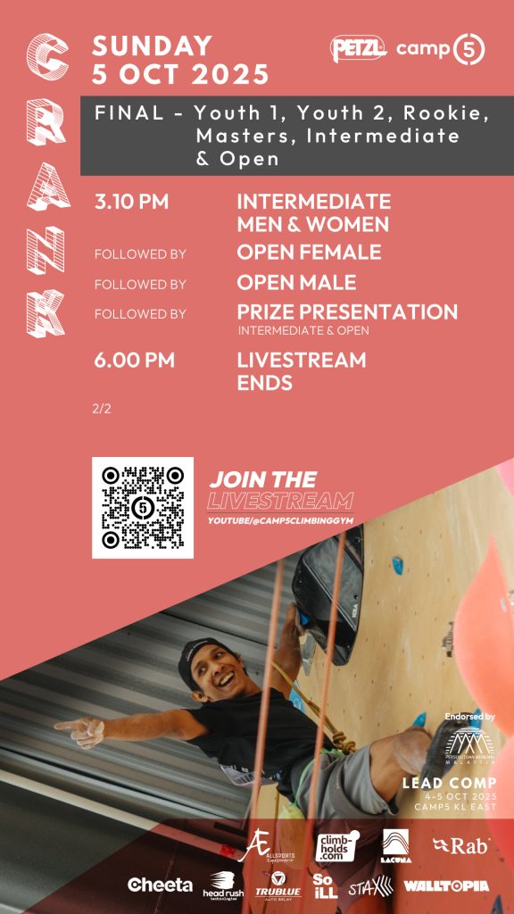 A series of fun Olympics-inspired, out-of-the-box climbing challenges held at Camp5’s KL branches in the weeks before Camp5’s Eco City’s 5th Anniversary Celebration. Each challenge will run for a week, from 6pm on the Friday until closing time the next Friday.